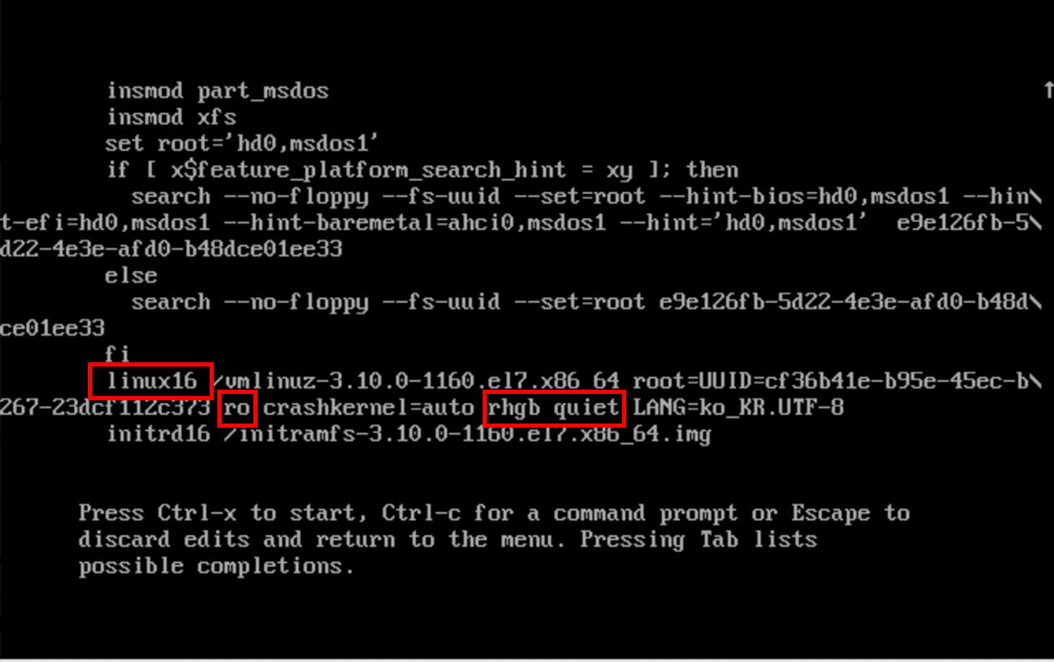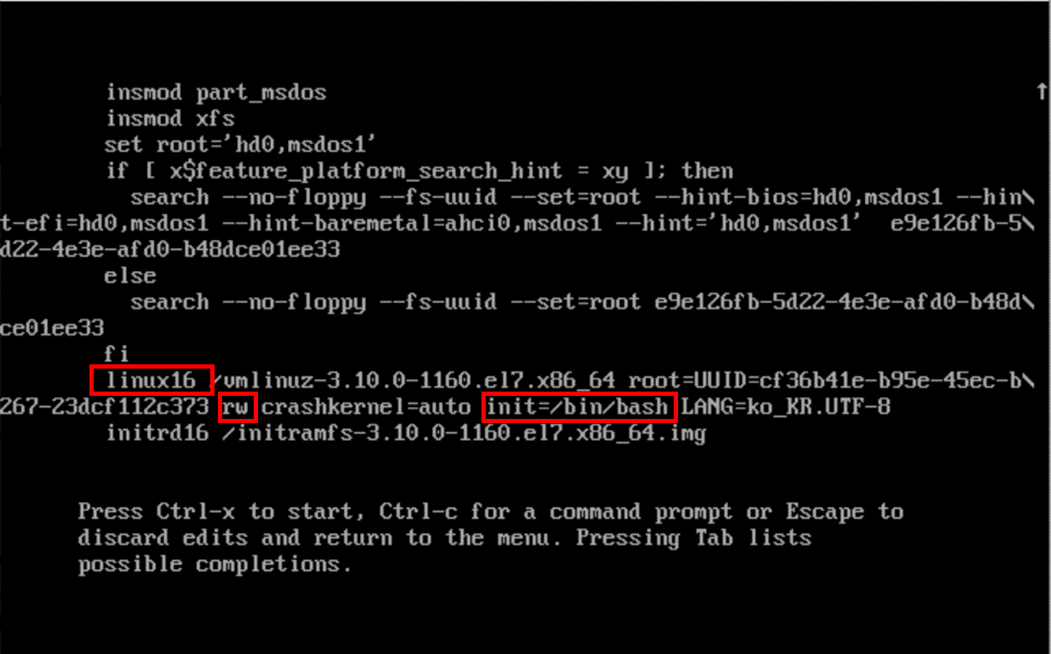 - 편집 후 'Ctrl + x' 를 눌러 부팅합니다.