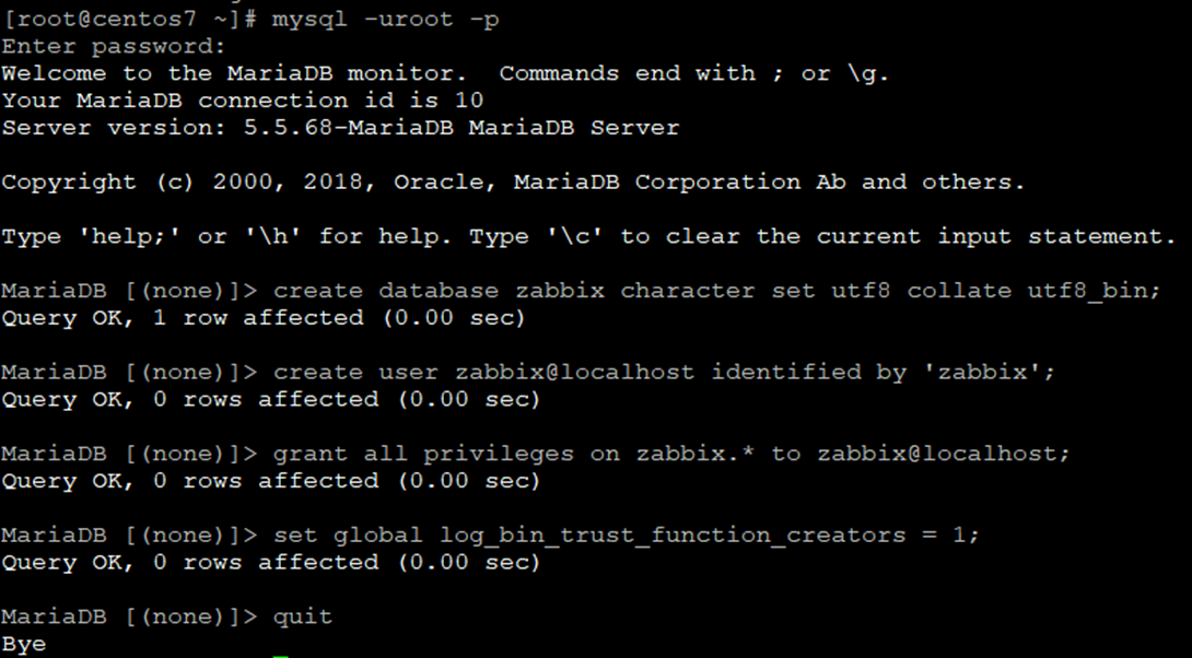 mysql> create database zabbix character set utf8 collate utf8_bin;