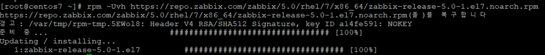 > # rpm -Uvh https://repo.zabbix.com/zabbix/5.0/rhel/7/x86_64/zabbix-release-5.0-1.el7.noarch.rpm