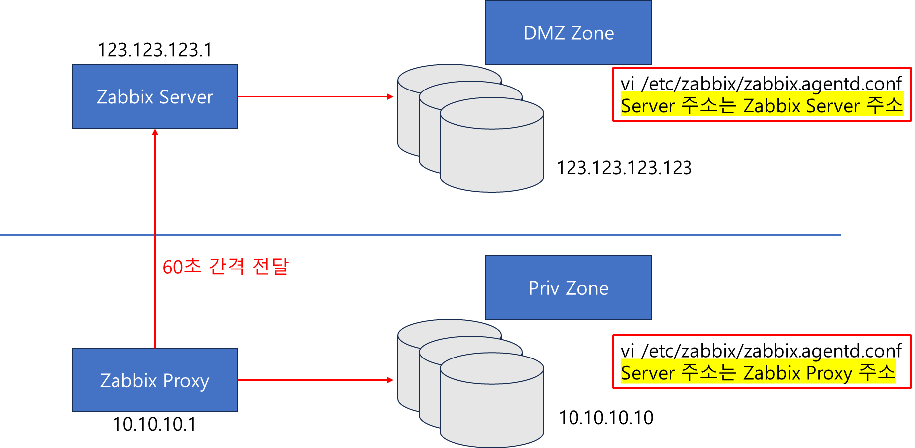 기본적으로 Zabbix 프록시는 60초마다 데이터를 서버로 전송합니다. - 서버 수신: Zabbix 서버는 프록시로부터 데이터를 수신하고, 이를 바탕으로 모니터링 및 알림 작업을 수행합니다.