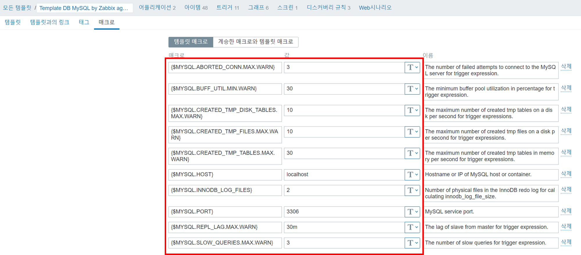 * {$MYSQL.HOST} / {$MYSQL.PORT} 의 경우 템플릿의 매크로를 불러다가 사용함.